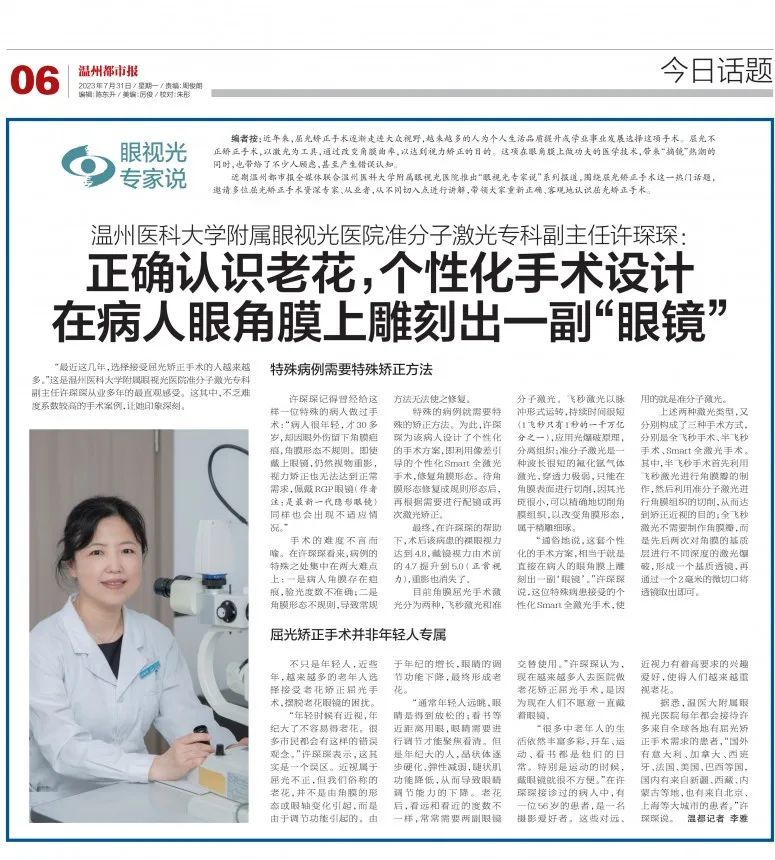 ? ? ? “最近這幾年,選擇接受屈光矯正手術(shù)的人越來(lái)越多?!边@是溫州醫(yī)科大學(xué)附屬眼視光醫(yī)院準(zhǔn)分子激光專(zhuān)科副主任許琛琛從業(yè)多年的最直觀(guān)感受。這其中,不乏難度系數(shù)較高的手術(shù)案例,讓她印象深刻。