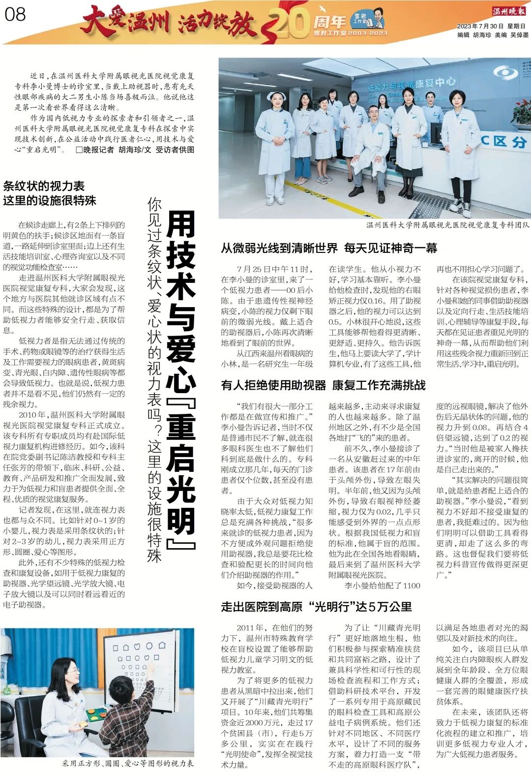 ? ? ?作為國內(nèi)低視力專業(yè)的探索者和引領(lǐng)者之一,溫州醫(yī)科大學附屬眼視光醫(yī)院視覺康復專科在探索中實現(xiàn)技術(shù)創(chuàng)新,在公益活動中踐行醫(yī)者仁心,用技術(shù)與愛心“重啟光明”。