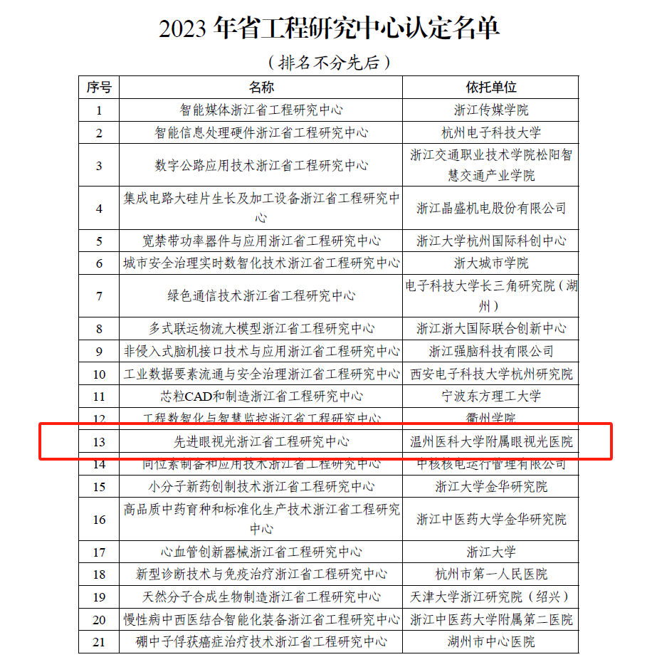 ? ? ? 11月7日,浙江省發(fā)展和改革委員會(huì)公布了2023年省工程研究中心認(rèn)定名單,依托溫醫(yī)大附屬眼視光醫(yī)院的先進(jìn)眼視光浙江省工程研究中心成功入選。