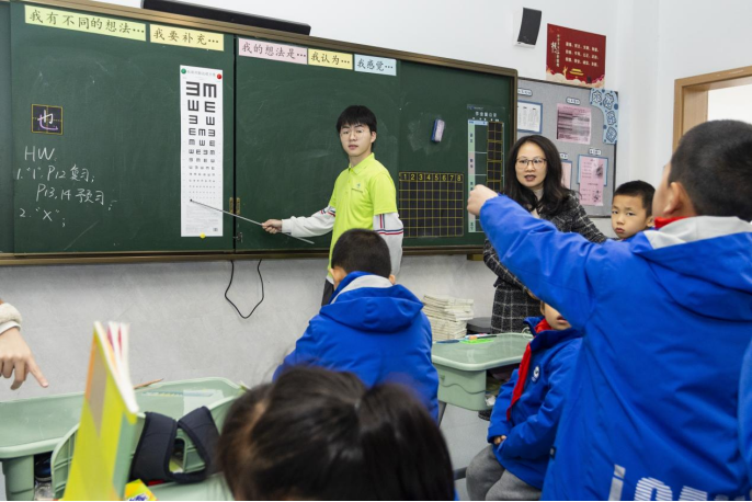? ? ? 活動當(dāng)天,溫州醫(yī)科大學(xué)大學(xué)生近視防控科普團(tuán)十多位成員走入實驗小學(xué)桃花島校區(qū)各班級,協(xié)助并指導(dǎo)小朋友現(xiàn)場開展班內(nèi)視力自測。