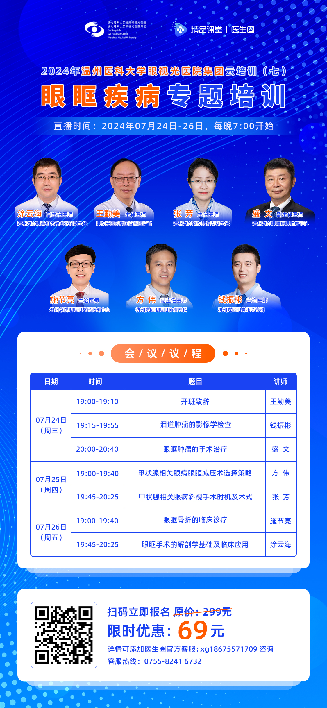 ? ? ? 為提高眼科醫(yī)師對眼眶疾病的診療水平,溫州醫(yī)科大學(xué)眼視光醫(yī)院集團首席醫(yī)療官王勤美教授,攜手資深講師團,為大家?guī)?天6課時的“眼眶疾病診療”專題系列培訓(xùn)課程。授課內(nèi)容豐富,實用性強,探討和解決臨床的實際問題。