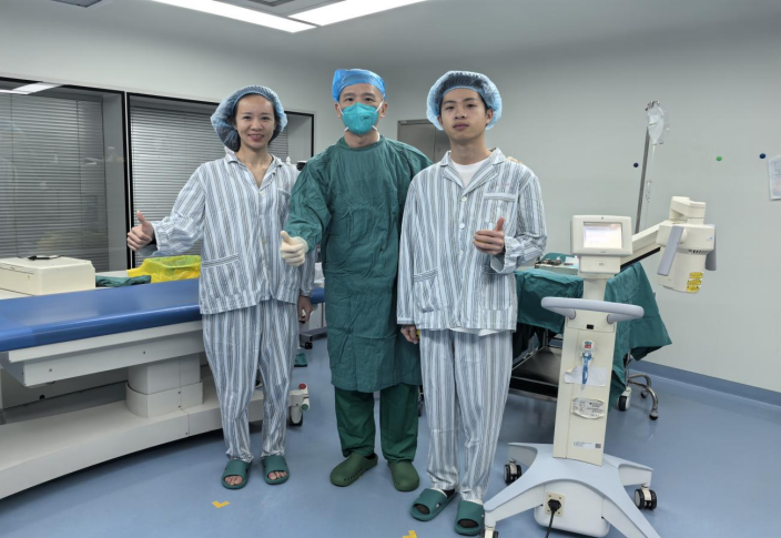 ? ? ? 手術(shù)前,屈光手術(shù)中心主任陳世豪及團(tuán)隊(duì)根據(jù)母子倆各自的眼部情況,精心設(shè)計(jì)了個(gè)性化的手術(shù)方案。陳女士雖近視度數(shù)不深,卻伴有老花,陳世豪巧妙地為她左眼預(yù)留了150度近視,以延緩其佩戴老花鏡的時(shí)間。而小施,因角膜形態(tài)特殊,陳世豪特地為他量身定制了Smart全激光聯(lián)合角膜交聯(lián)術(shù)的個(gè)性化手術(shù)方案,確保良好的術(shù)后效果。