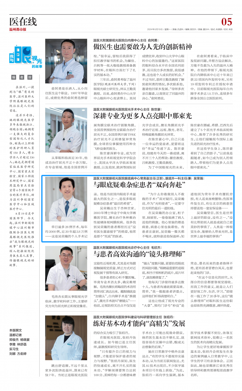 ? ? ? 單日最多26例手術(shù),每年約2000例,近20年超2.8萬例——這是溫州醫(yī)科大學(xué)附屬眼視光醫(yī)院眼底病中心常務(wù)副主任(正職,執(zhí)行主任)、眼底外一科主任(兼) 吳榮瀚的個人手術(shù)記錄。