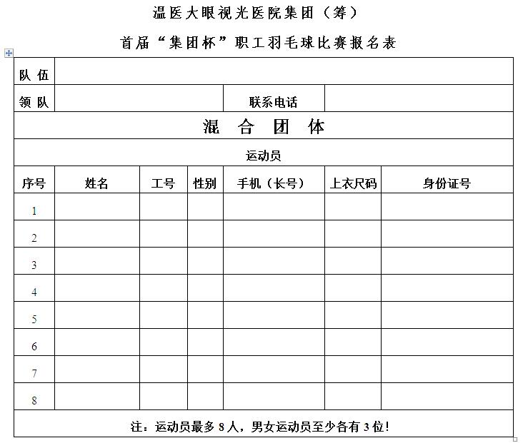 活動(dòng)對(duì)象 溫醫(yī)大眼視光醫(yī)院集團(tuán)(籌)正式職工,以溫州工會(huì)各小組和各分院為單位,各自組隊(duì) 主辦單位 溫醫(yī)大工會(huì)眼視光學(xué)院、醫(yī)院、生工學(xué)院委員會(huì) 承辦單位 溫州眼視光羽毛球俱樂部 活動(dòng)時(shí)間 2018年6月10日(周日8:00-17:00)(如有變更會(huì)另行通知)