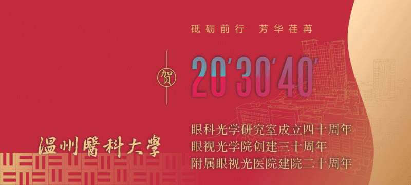 砥礪歌行數(shù)十載,不忘初心再揚帆。溫州醫(yī)科大學(xué)眼科光學(xué)研究室成立40周年、眼視光學(xué)院創(chuàng)建30周年、附屬眼視光醫(yī)院建院20周年院慶紀(jì)念活動,將于2018年9月26日至10月26日期間舉行。在這繼往開來的時刻,我們以“砥礪前行 芳華荏苒”為主題,舉辦一系列學(xué)術(shù)和文化活動,使院慶成為校友的舞臺、師生的節(jié)日、文化和學(xué)術(shù)的盛會。